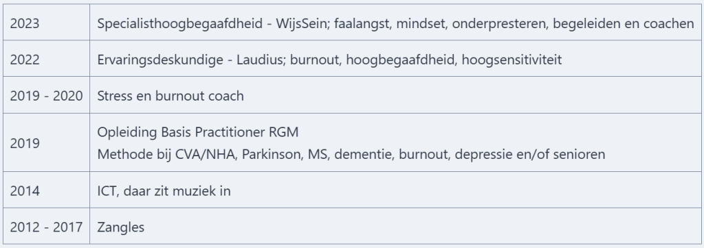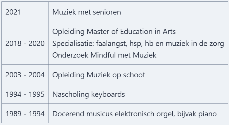 Docente muziek met baby’s, dreumesen en peuters, workshopbegeleider bij PSZ, spreker m.b.t. muziek op schoot, componist en performer bij muziekc.d. Muziekplezier II, opleider Mos bij PSZ